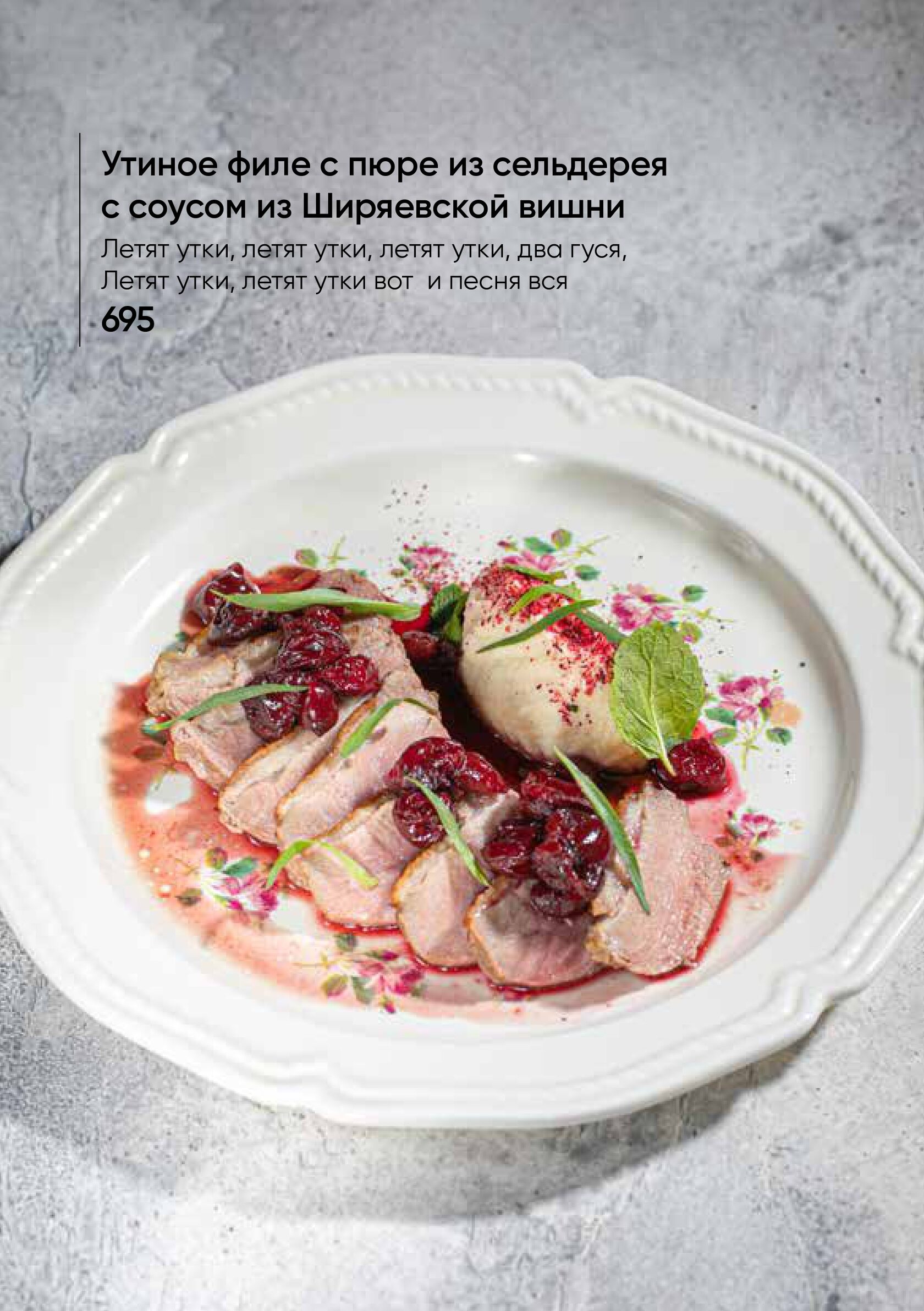 - Утиное филе с пюре из сельдерея с соусом из Ширяевской вишни